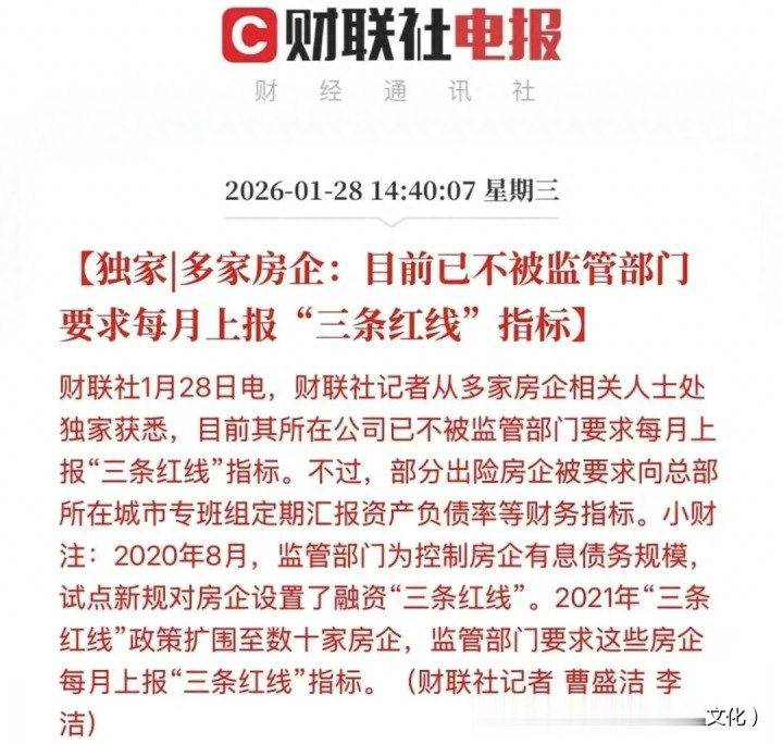 就在刚刚,财联社独家证实,房企月度上报三条红线的历史使命终结。